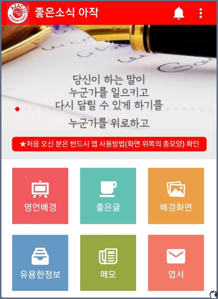 앱으로 들어가면 명언배경 부터 시작해서 좋은글, 배경화면 등의 메뉴를 확인할 수 있는데요.