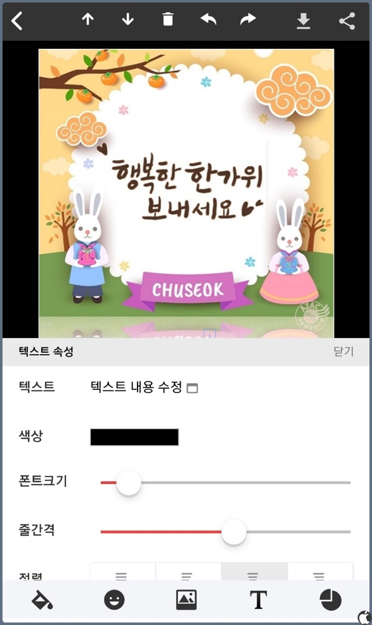 이 상태에서 여기 적힌 문구를 그대로 사용해도 되지만 혹시 아까 확인했던 추석 인사 문구로 교체하고 싶다면 수정하는 게 가능합니다. 아래쪽에 있는 연필모양 아이콘으로 들어오면 이렇게 다양한 설정이 가능한데요.