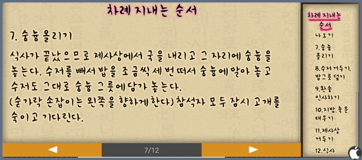 이 앱은 상차림 예절과 차례 지내는 순서 그리고 지방쓰는 방법과 절하는 방법이 정리되어 있는데요. 그림으로 보기를 통해 이렇게 그림 확인도 가능하고, 이름으로 보기를 통해 각 메뉴의 이름도 확인할 수 있습니다.