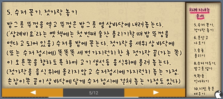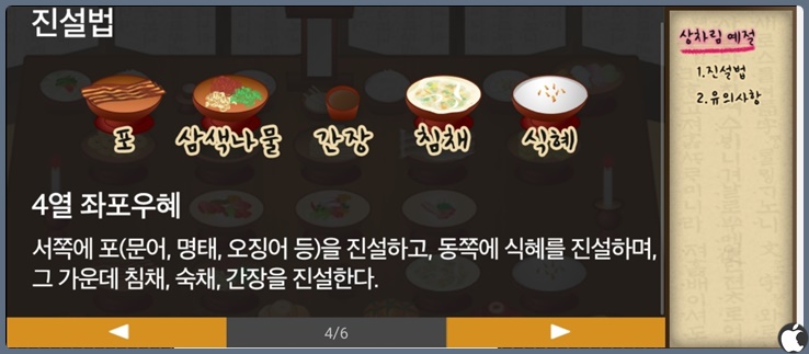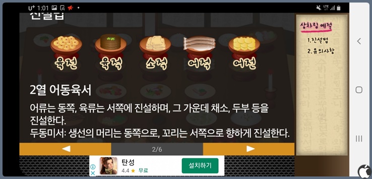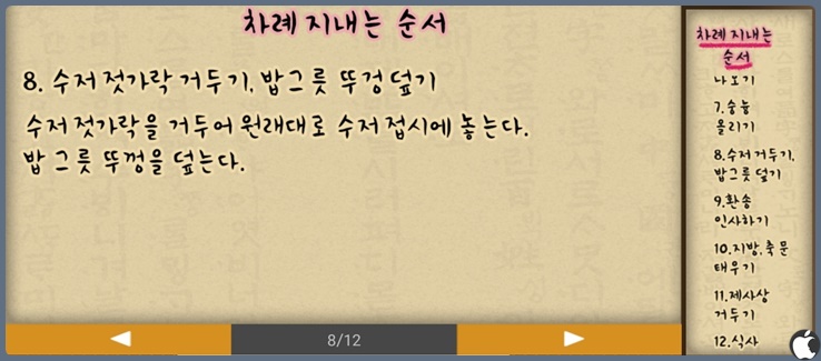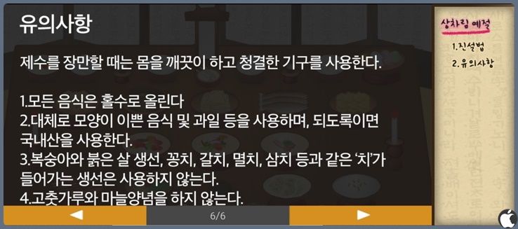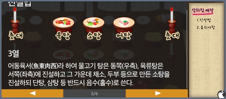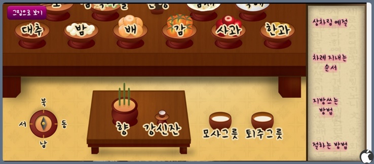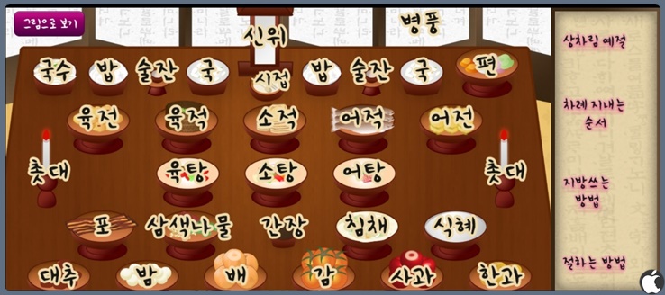 이 앱은 상차림 예절과 차례 지내는 순서 그리고 지방쓰는 방법과 절하는 방법이 정리되어 있는데요. 그림으로 보기를 통해 이렇게 그림 확인도 가능하고, 이름으로 보기를 통해 각 메뉴의 이름도 확인할 수 있습니다.