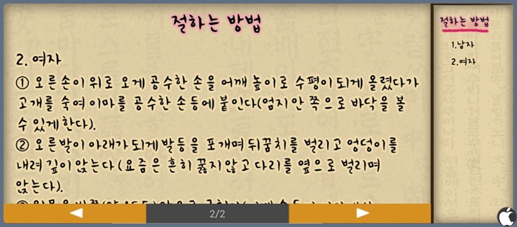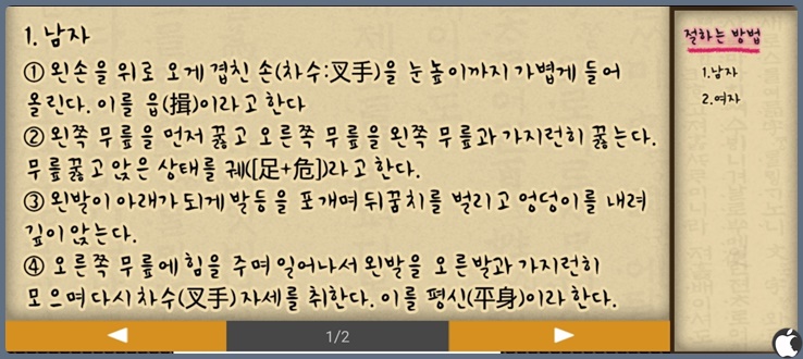 이번에는 절하는 방법 입니다. 남자의 경우 왼손을 위로 오게 한 뒤 왼쪽 무릎을 먼저 꿇고 오른쪽 무릎을 꿇어야 합니다. 조금 복잡하게 적혀 있지만 다른 것은 크게 신경 쓸 필요가 없습니다.