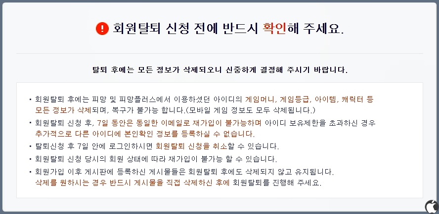 회원탈퇴시에는 지금 까지 이용했던 게임머니, 게임등급 혹은 아이템 등이 모두 삭제 됩니다. 참고로 모바일 피망 게임도 같은 계정으로 연결되어 있다면 모두 삭제 되며, 탈퇴하면 7일간은 같은 이메일로 가입할 수 없게 됩니다. 그리고 계정삭제를 하더라도 7일간은 다시 취소하는 것도 가능하다고하니 참고해주시길 바랍니다.
